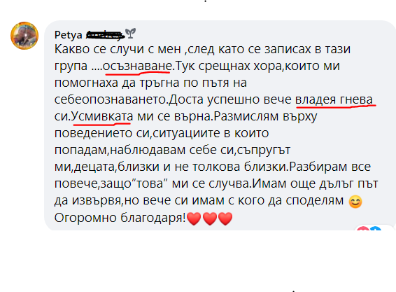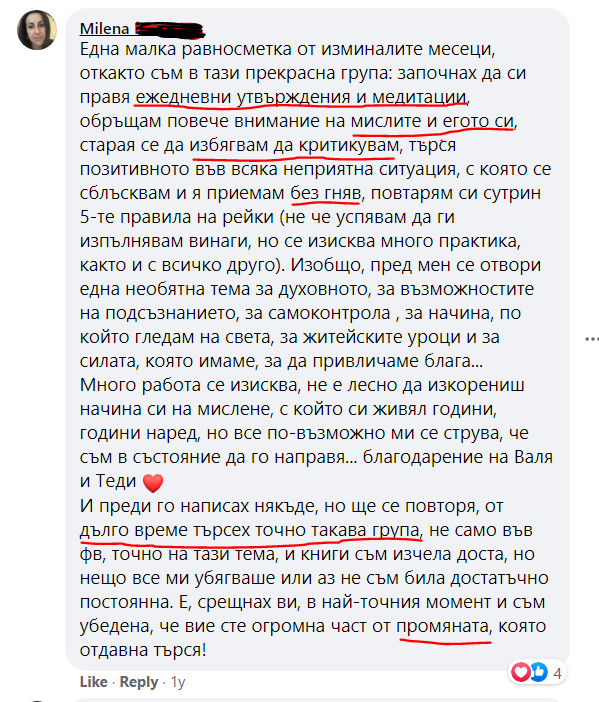 Освен медитации в групата всяка седмица получавате и знания за енергийните центрове, НЛП, типичните ежедневни ситуации и как да се справяме с тях, как да повдигаме енергията си, как да привличаме в живота си положителни неща, как да използваме правилно закона за привличането.