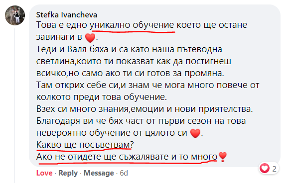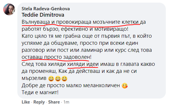 ”Семинарът наистина си заслужаваше! По пътя към залата си мислех единствено колко е далеч. Наобратно си мислех: И пеш бих го минала това разстояние! Позитивно заредена от новите знания, които придобих, и изпълнена с нетърпение да ги приложа! Не спирайте да се развивате, да научавате нови неща, за да бъдете успешни!”