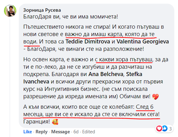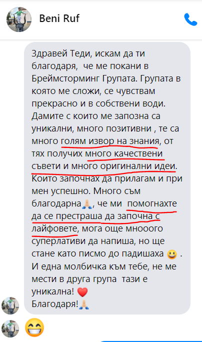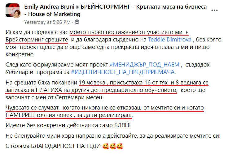 “Вчера успях да приключа курса на Teddie Dimitrova и научих колко много неща правя грешно. Много полезна информация, препоръчвам го с 5 ръце! Както казват англичаните: An Eye Opener!”