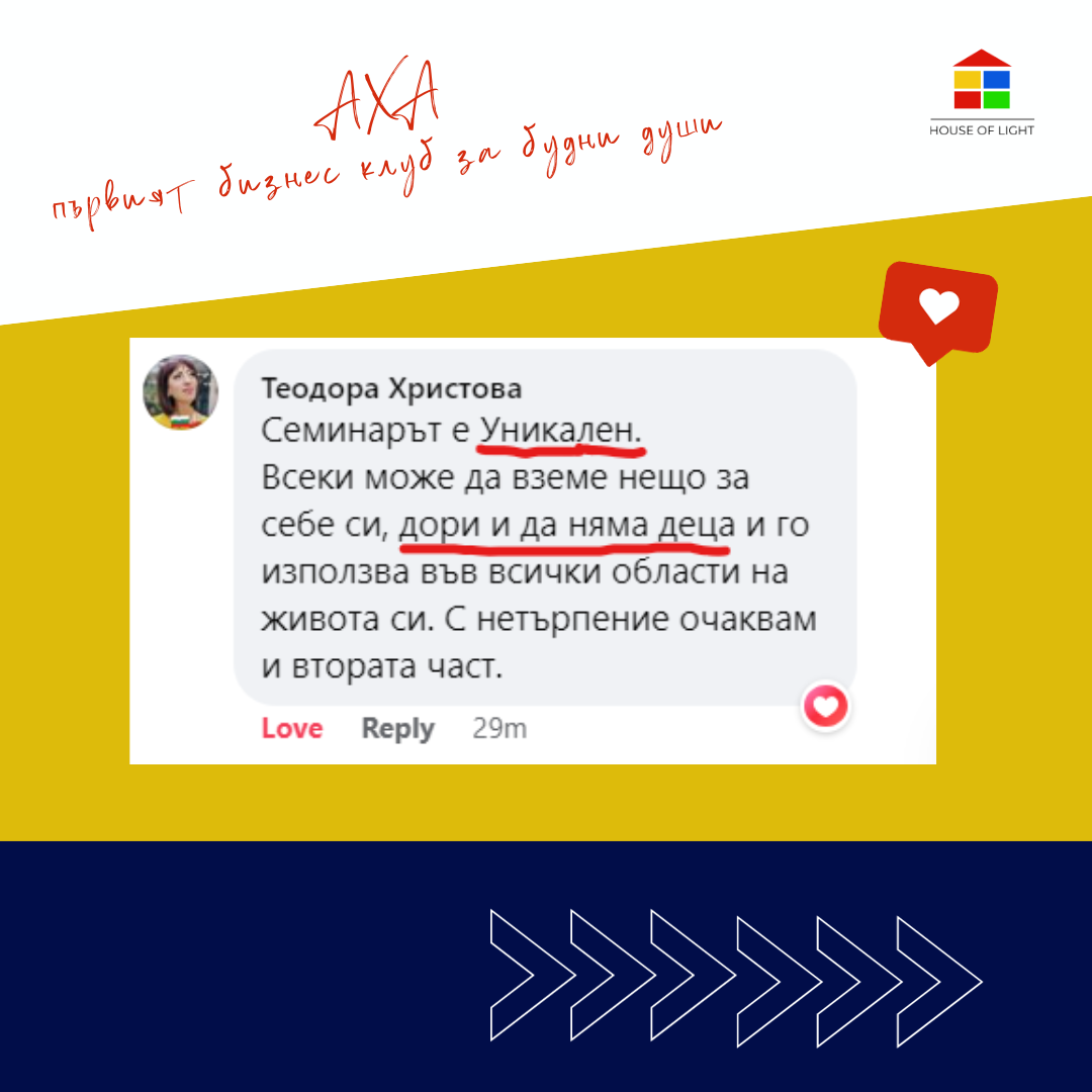 ”Семинарът наистина си заслужаваше! По пътя към залата си мислех единствено колко е далеч. Наобратно си мислех: И пеш бих го минала това разстояние! Позитивно заредена от новите знания, които придобих, и изпълнена с нетърпение да ги приложа! Не спирайте да се развивате, да научавате нови неща, за да бъдете успешни!”